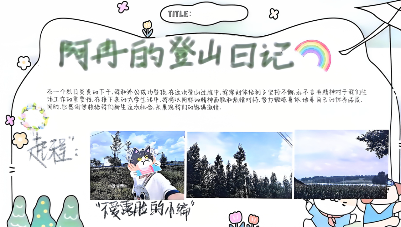 体育活动中,大家走出家门,去登山,去徒步,去看祖国的大好河山。用汗水与激情绘制了一幅活力四溢的“动力”画卷,不做“脆皮青年”。并在运动之后和大家分享了本次的心得体会。同学们在这个假期中的体育活动,不仅是身体的锻炼,更是心灵的成长。他们用行动诠释了坚持与拼搏的力量,为踏入大学生活做更充足的准备。